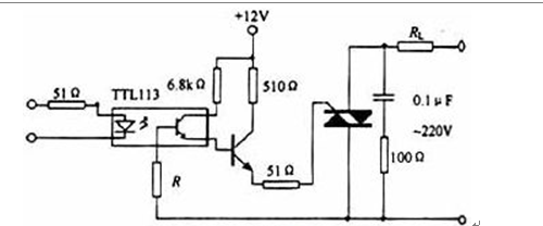 在微機控制系統(tǒng)中,大量應用的是開關量的控制,這些開關量一般經過微機的I/O輸出,而I/O的驅動能力有限,一般不足以驅動一些點磁執(zhí)行器件,需加接驅動介面電路,為避免微機受到干擾,須采取隔離措施。如可控硅所在的主電路一般是交流強電回路,電壓較高,電流較大,不易與微機直接相連,可應用光耦合器將微機控制信號與可控硅觸發(fā)電路進行隔離。電路實例如圖7所示。