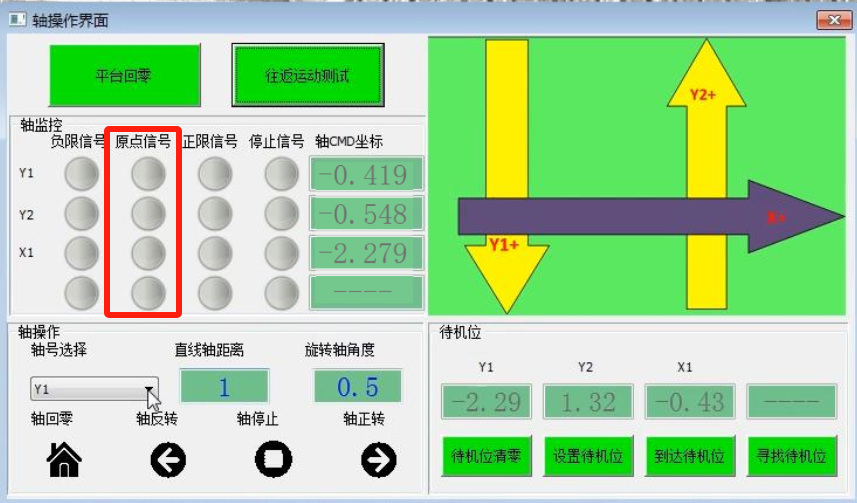 原點信號:在“軸號選擇”選擇當前想操作的軸序號,顯示該軸的 原點限位感應(yīng)器狀態(tài),灰色為無信號,綠色為有信號;