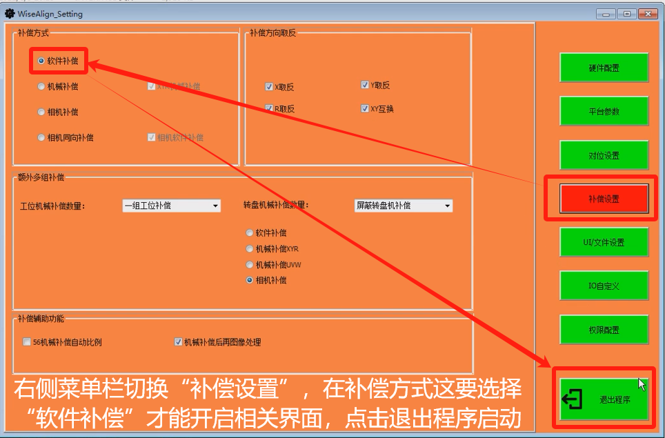 右側(cè)菜單欄,選擇“補償設(shè)置”在補償方式處可以看到當(dāng)前軟件選擇的補償方式,如果不是軟件補償,勾選上即可,選擇完畢后,點擊退出程序啟動軟件。