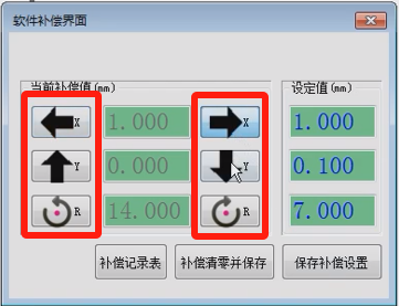 進入軟件,在右側(cè)功能按鍵欄,點擊“對位補償”打開對位補償界面,可以看到界面大致分為三個區(qū)塊“當(dāng)前補償值”“設(shè)定值”“功能按鍵”