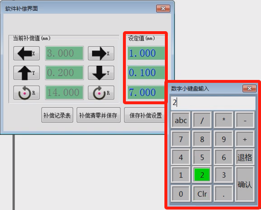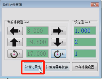點擊左側(cè)的XYR補償按鈕,單擊一次按鈕以右側(cè)“設(shè)定值”遞增或者遞減;
