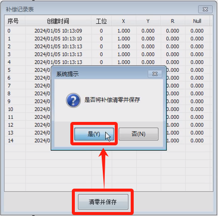 補償清零并保存:點擊“補償清零并保存”在彈出提示框點擊“是”會將當(dāng)前的XYR的補償值清零并保存料號文件中
