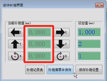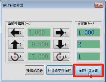 保存補償設(shè)置:點擊下方的“保存補償設(shè)置”按鍵,設(shè)置當(dāng)前的XYR的補償值并保存料號文件中