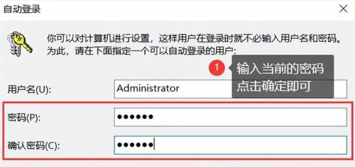 在“密碼”和“確認(rèn)密碼”那里輸入之前設(shè)置的本地賬戶密碼,再點(diǎn)擊“確定”就可以了,下次開(kāi)機(jī)就不需要登錄密碼。