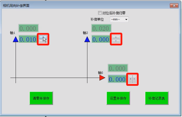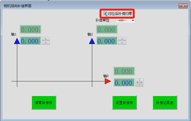 對位后補償歸零:填入補償值后,系統(tǒng)執(zhí)行對位一次后,會將界面的補償值寫入系統(tǒng)中,并將界面的數(shù)值設(shè)置成0;