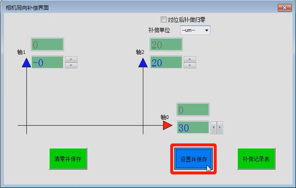 設(shè)置并保存:點擊下方的“設(shè)置并保存”按鍵,將當(dāng)前的補償值設(shè)置并保存于文件中;