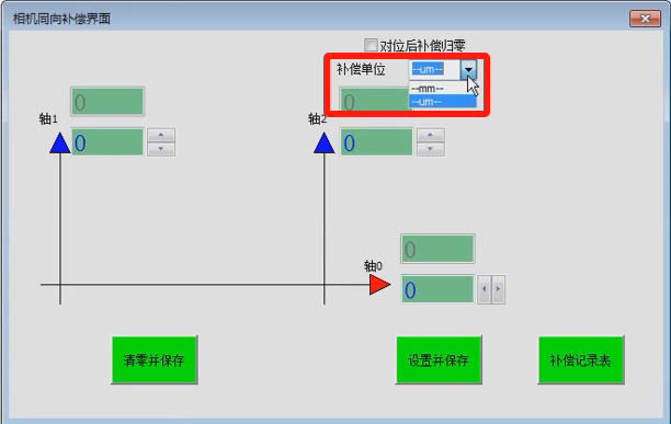補償單位:在上方點擊補償單位,彈出欄內(nèi)可以看到有mm(毫米)與um(微米)兩種補償單位可以選擇,根據(jù)客戶需要可以自行進(jìn)行調(diào)整。