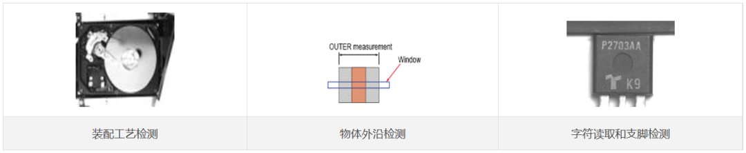 檢測范圍:部件位置、尺寸、物體外沿、字符讀取及校驗、支腳、外觀等檢測。