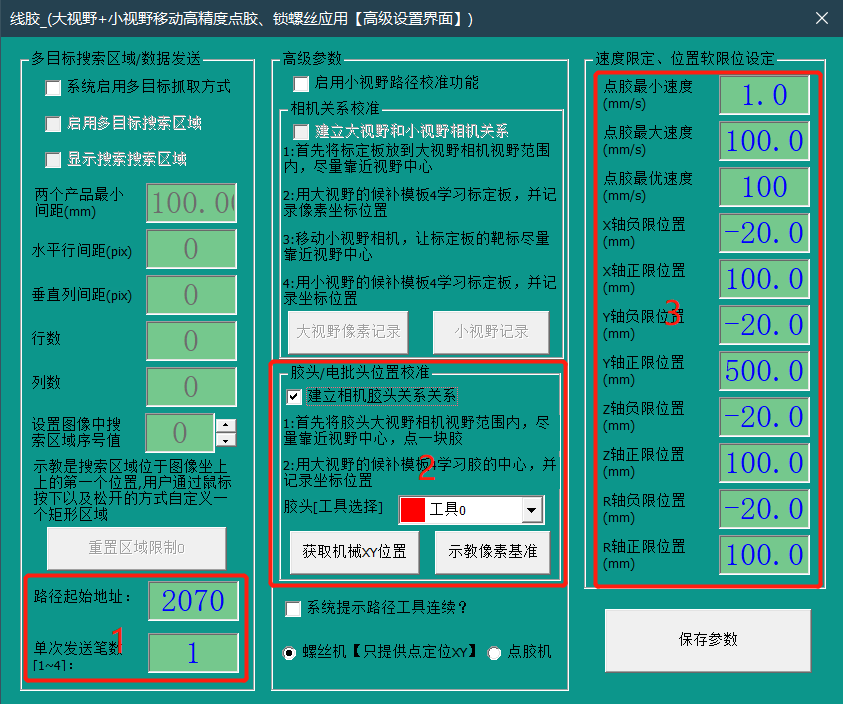 3:速度、限位設(shè)定:設(shè)置點膠速度、點膠相關(guān)軸的軟極限