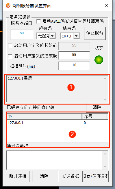 端口參數(shù):①可以看到連接、斷開、接收的數(shù)據(jù)