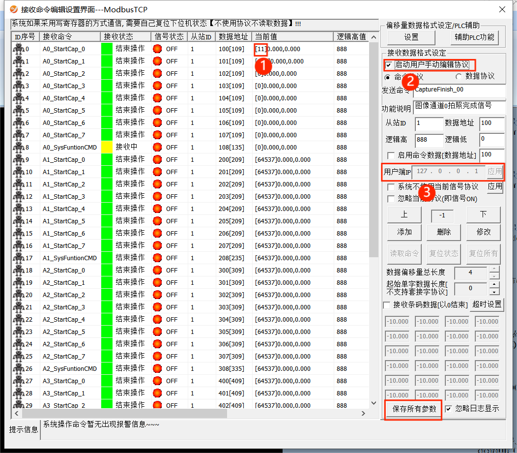 ①是PLC發(fā)送過來,視覺接收到的數(shù)據(jù),點擊②之后才能進(jìn)行編輯右邊的數(shù)據(jù),要保證③IP地址和PLC的地址一樣,修改后點擊下面“保存所有參數(shù)”保存,然后點擊②才可以退出