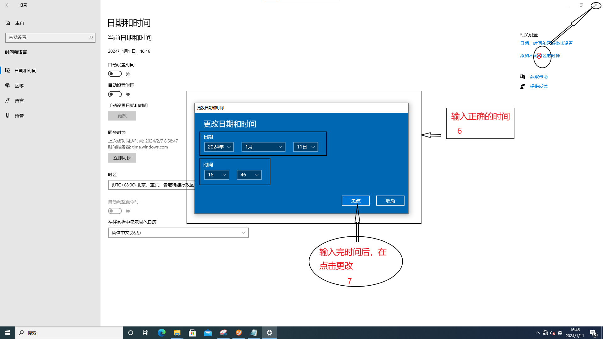5、將系統(tǒng)時間設(shè)置成標(biāo)準(zhǔn)時間 >> 點(diǎn)擊“更改”>>點(diǎn)擊“X”關(guān)閉頁面