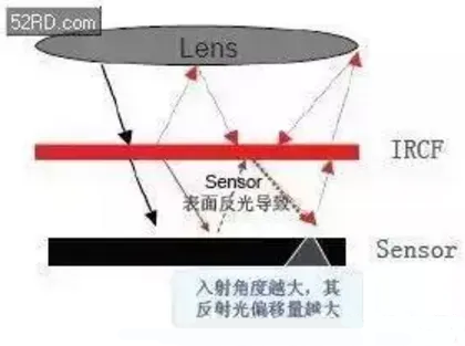 普通IR采用反射式,在可見光區(qū)域有較高透過率的同時(shí),存在較低的反射率,而在紅外區(qū)域正好相反,反射較高。所以,當(dāng)相機(jī)在成角度拍攝照片時(shí)紅外光在IR膜上會(huì)有較大反射,經(jīng)過光線多次反射后,會(huì)在照片上形成光暈現(xiàn)象。