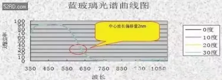 普通IR中心波長偏移量在入射角0°~30°,偏移30nm左右,會(huì)形成色彩不均勻現(xiàn)象;藍(lán)玻璃IR中心波長偏移量在入射角0°~30°,偏移2nm左右,不會(huì)出現(xiàn)黑角及紅斑現(xiàn)象。