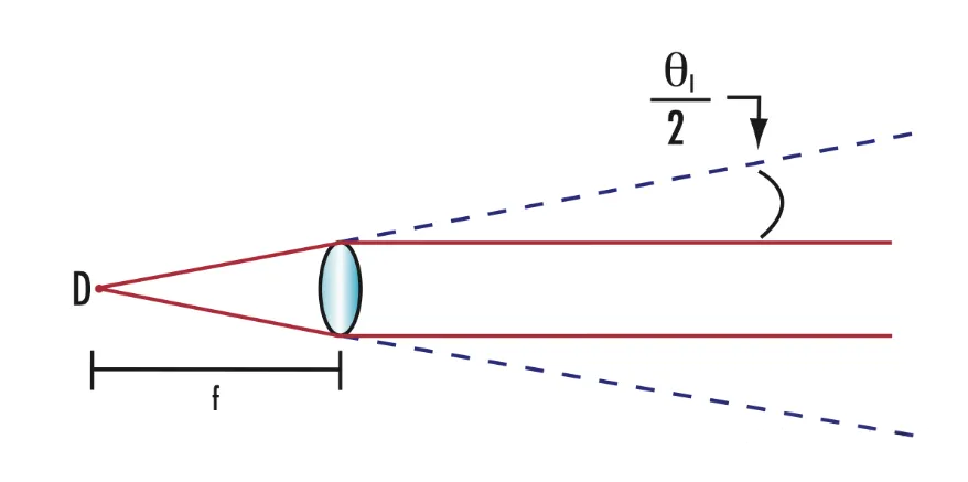 當(dāng)光源的光線相互平行傳播時(shí),就會(huì)發(fā)生準(zhǔn)直光。這是通過(guò)使用光學(xué)器件來(lái)操縱發(fā)散光束,或者通過(guò)將發(fā)散源放置在離物體足夠遠(yuǎn)的地方,使其在到達(dá)物體時(shí)看起來(lái)是準(zhǔn)直的來(lái)實(shí)現(xiàn)的。通過(guò)將發(fā)散源定位在正透鏡的焦點(diǎn)處,光線在經(jīng)歷折射后將準(zhǔn)直。光源和所用特定透鏡的尺寸將決定所得光束的準(zhǔn)直程度。方程1顯示了準(zhǔn)直光束中剩余發(fā)散度θ、光源直徑D和準(zhǔn)直透鏡焦距f之間的關(guān)系。該方程不考慮可能影響準(zhǔn)直光束質(zhì)量的其他方面,例如透鏡的形狀因子、圖形誤差或折射表面的粗糙度。方程1顯示了在合成發(fā)散和光收集之間經(jīng)常需要的折衷。圖1概述了一個(gè)簡(jiǎn)單的準(zhǔn)直裝置,并演示了準(zhǔn)直光束的端徑如何與所用準(zhǔn)直透鏡的端徑相等。