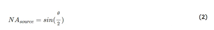 在為成像系統(tǒng)選擇合適的透鏡和照明源對(duì)時(shí),數(shù)值孔徑是最重要的考慮因素之一。透鏡的數(shù)值孔徑是一個(gè)無(wú)單位的數(shù)字,用來(lái)描述其收集離軸光的能力。方程2表明,源的NA由其散度θ定義。