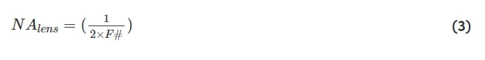 成像透鏡的數(shù)值孔徑可以作為制造規(guī)范的一部分包括在內(nèi),但也可以使用其F數(shù)的倒數(shù)來(lái)估計(jì)(如方程3所示)。由于兩者直接相關(guān),NA也可用于定義成像透鏡的分辨率和景深。