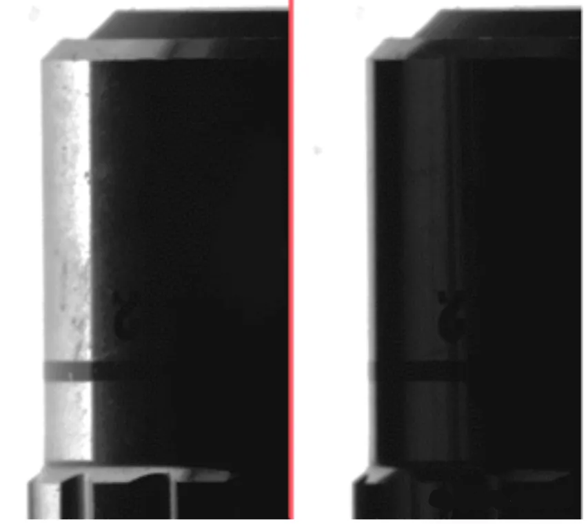 為了遮蔽背光,應(yīng)使用諸如絨毛紙之類的不透明材料來(lái)阻擋背光中不需要的部分。這種方法是有利的,因?yàn)樗菍?duì)光的快速且低成本的修改。缺點(diǎn)是遮罩無(wú)法完全消除邊緣散射,并且可能需要為不同大小的對(duì)象不斷重新遮罩燈光。當(dāng)物體在透鏡視場(chǎng)中移動(dòng)時(shí)被檢查的物體也不能有效地被掩蓋。圖8比較了已屏蔽的背光和未屏蔽的背光。