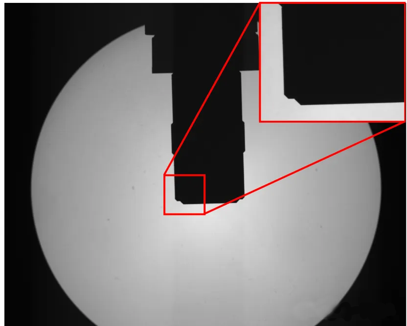遠(yuǎn)心照明器的主要優(yōu)點(diǎn)是通過(guò)其光學(xué)設(shè)計(jì)實(shí)現(xiàn)的高度準(zhǔn)直。發(fā)散LED光源集成到組件中,產(chǎn)生準(zhǔn)直光線,通常在不到一度的真實(shí)準(zhǔn)直范圍內(nèi)。這些類型的遠(yuǎn)心照明器是通過(guò)精確定位一個(gè)大的正透鏡和一個(gè)小而強(qiáng)大的LED來(lái)構(gòu)建的,從而創(chuàng)建一個(gè)照明輪廓,該輪廓可以創(chuàng)建清晰的輪廓,并比其他背光方法更好地匹配遠(yuǎn)心成像透鏡的NA。圖13顯示了由遠(yuǎn)心照明器背光的圖10中的同一物體。該物體沒(méi)有表現(xiàn)出從傳統(tǒng)背光中看到的邊緣散射效應(yīng),并且與準(zhǔn)直背光相比具有更尖銳的邊緣過(guò)渡。圖14證實(shí)了這種急劇的轉(zhuǎn)變,從亮到暗的斜率發(fā)生在不到10個(gè)像素的范圍內(nèi)。