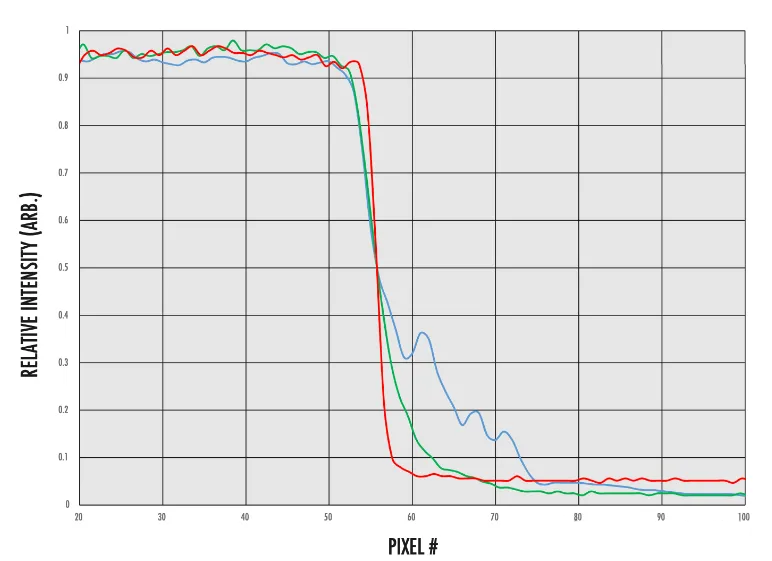 這種散射會(huì)表現(xiàn)為邊緣出現(xiàn)梯度和模糊,這可能會(huì)使用戶或軟件很難分辨出物體的邊緣在哪里。大量散射也可能照亮物體的不必要部分,并導(dǎo)致獲取誤導(dǎo)性數(shù)據(jù)。圖6所示的邊緣輪廓具有從亮到暗(從高到低)的相對(duì)強(qiáng)度,范圍約為30個(gè)像素,物鏡側(cè)面的文字會(huì)在數(shù)據(jù)中產(chǎn)生波紋。