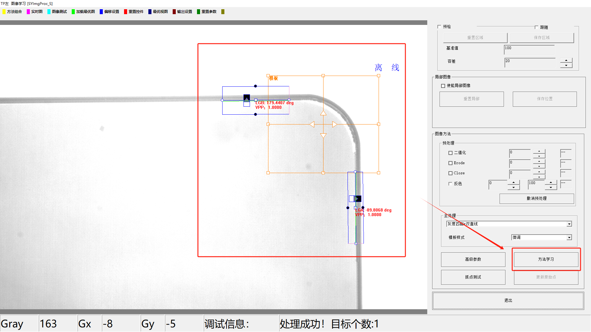 2、下拉重新選擇“灰度匹配+雙直線”,黃色的模板框工具則會(huì)顯示出來,調(diào)整模板框位置和大小到合適,再點(diǎn)擊“方法學(xué)習(xí)”,則學(xué)習(xí)記錄當(dāng)前的模板。