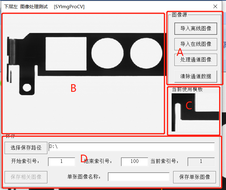 區(qū)域A:圖像源操作,導(dǎo)入離線/在線圖像,圖像處理以及清除當(dāng)前通道數(shù)據(jù);