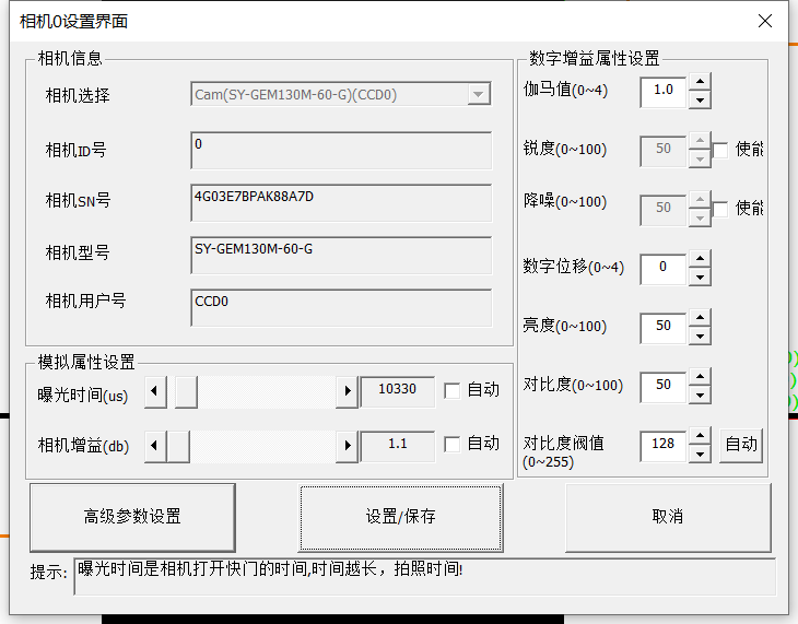 相機(jī)增益(db):相機(jī)感光芯片的參數(shù),以2的N次方增加亮度,調(diào)整比較靈敏并且會(huì)帶來噪點(diǎn),默認(rèn)值是1!