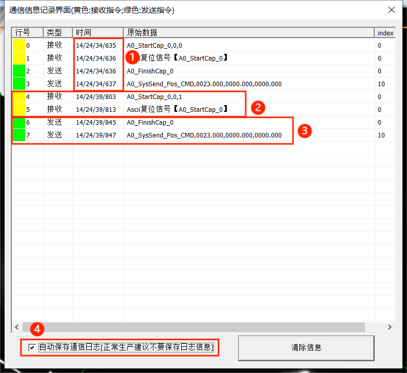 ①是一個(gè)流程的運(yùn)行時(shí)間,由機(jī)器人發(fā)信號(hào)到視覺返回信號(hào)為一個(gè)通訊流程,時(shí)間是由時(shí)、分、秒、毫秒組成,例如圖中14/24/34/635 就是14時(shí)24分34秒635毫秒
