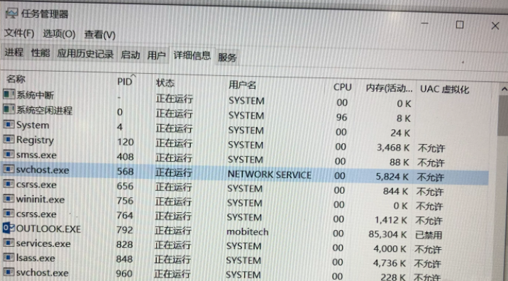 根據(jù)事件日志中給出來(lái)的信息,查找到名稱(chēng),狀態(tài),用戶(hù)名等更加詳細(xì)的信息。PID是568,對(duì)應(yīng)的是NETWORKSERVICE用戶(hù),應(yīng)該是這個(gè)用戶(hù)的權(quán)限問(wèn)題。