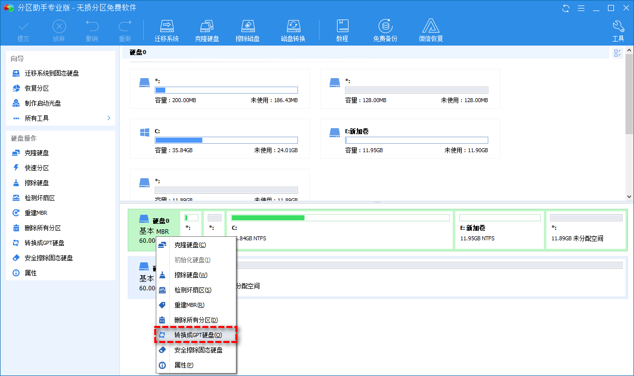 3、打開分區(qū)助手,選中你的磁盤右鍵“轉(zhuǎn)換成GPT”,如果你電腦只有一塊硬盤,那就選它就完事了,如果多塊,找到你引導(dǎo)項(xiàng)所在的硬盤