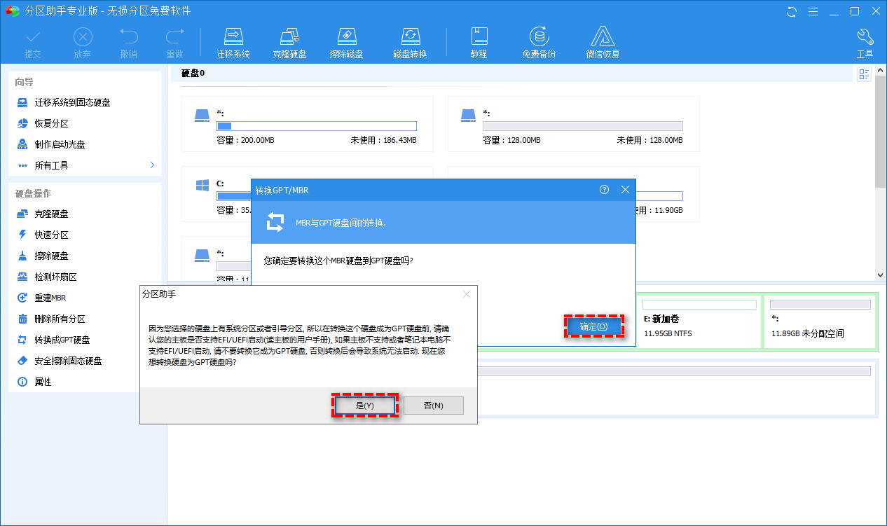 5、返回主界面,單擊左上角“提交”按鈕以預(yù)覽即將進(jìn)行的任務(wù),確認(rèn)無誤后單擊“執(zhí)行”以開始將MBR轉(zhuǎn)換成GPT磁盤