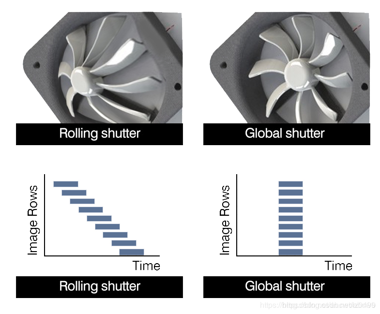與Global shutter不同,它是通過Sensor逐行曝光的方式實現(xiàn)的。在曝光開始的時候,Sensor逐行掃描逐行進行曝光,直至所有像素點都被曝光。當(dāng)然,所有的動作在極短的時間內(nèi)完成。不同行像元的曝光時間不同。