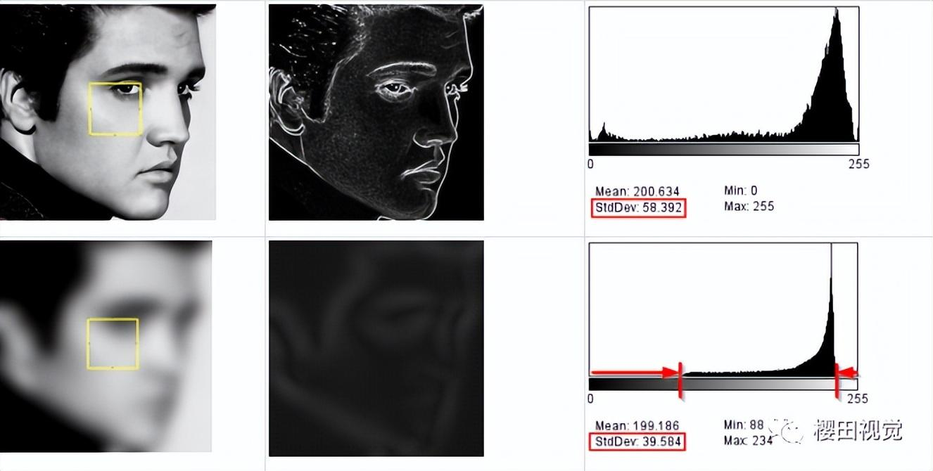 第二個原理是基于圖像直方圖的值的分析??梢杂脕碛嬎銏D像的平均灰度值的像素值的變化量。方差越大,現(xiàn)有的灰度值邊緣和圖像的對比度就越高。如果圖像變得不聚焦,那么之前的灰度值跳躍大的邊緣就會呈現(xiàn)斜坡形式的梯度,導(dǎo)致圖像的對比度降低。也就是說,圖像越清晰,灰度擴散越高,圖像中的對比度也就越高,圖像也越清晰。