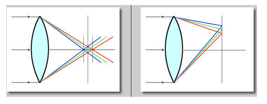 這個問題,同樣也會發(fā)生在當(dāng)你使用內(nèi)建閃光燈在室內(nèi)拍攝鍍鉻或鏡面物體時強烈反光中,也可以看到這樣的問題。嚴格來說,紫邊實際上是洋紅色(Magenta),這給了主張紫邊問題的產(chǎn)生,取決於數(shù)位相機CCD在色彩插值運算過程中,因藍B、R紅兩色混合誤差而產(chǎn)生有力的證據(jù)。另一派色散(Chromaticaberration)的說法,則舉出固有鏡片會對不同波長光波產(chǎn)生色散的例子來說明,紫邊的問題(見下圖)。這個說法最大的矛盾,在於傳統(tǒng)底片時代同樣的鏡頭卻鮮少發(fā)生紫邊問題。因此,很多解釋通常會給鏡頭和CCD 各打五十大扳!