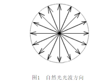 偏振是指橫波的振動矢量(垂直于波的傳播方向)偏于某些方向的現(xiàn)象,光的偏振現(xiàn)象是由法國工程師馬呂斯于1808年發(fā)現(xiàn)的。眾所周知,自然光是一種電磁波,屬于橫波,其在垂直于傳播方向的平面內(nèi)包含著一切可能方向的振動,且平均而言在任一方向上都具有相同的振幅,即振動方向是對稱的,如圖1所示。然而,當光的振動方向?qū)τ趥鞑シ较虿粚ΨQ性時,便成了偏振光。偏振現(xiàn)象橫波區(qū)別于其他縱波的一個最明顯的標志。