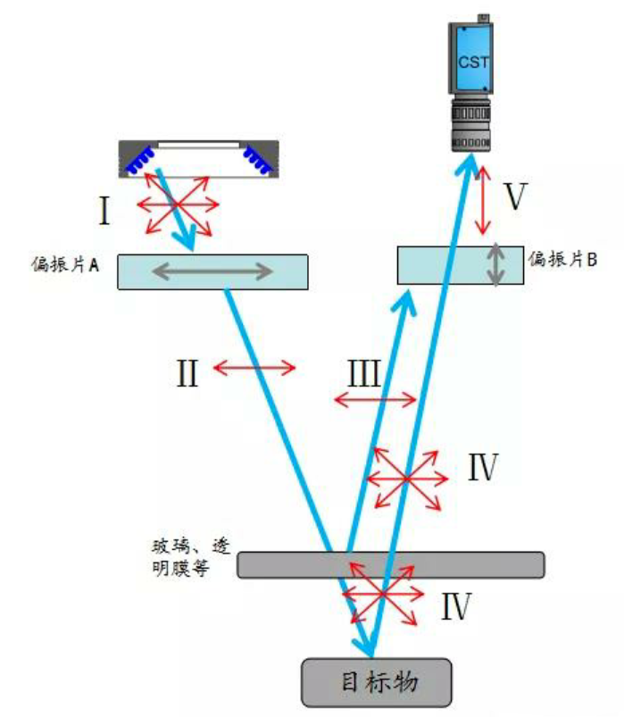 將光的偏振特性運用于機器視覺光源中,通過合理的設(shè)計改變光源所發(fā)射光波的振動方向,同時約束反射回相機的光波的振動方向,便可消除機器視覺中常見的強反光現(xiàn)象。偏光光源由此產(chǎn)生。