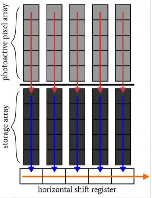 我們需要的最后一個(gè)主要的架構(gòu)改進(jìn)是將集成電荷快速轉(zhuǎn)移到存儲(chǔ)區(qū)域,從而將污跡降低到可以忽略的程度。線間傳輸 CCD 通過(guò)提供與每個(gè)光活動(dòng)位置相鄰的存儲(chǔ)(和傳輸)區(qū)域的網(wǎng)絡(luò)來(lái)實(shí)現(xiàn)這一點(diǎn)。曝光完成后,傳感器中的每個(gè)電荷包同時(shí)傳輸?shù)椒枪饷舸怪币莆患拇嫫髦小?/p>