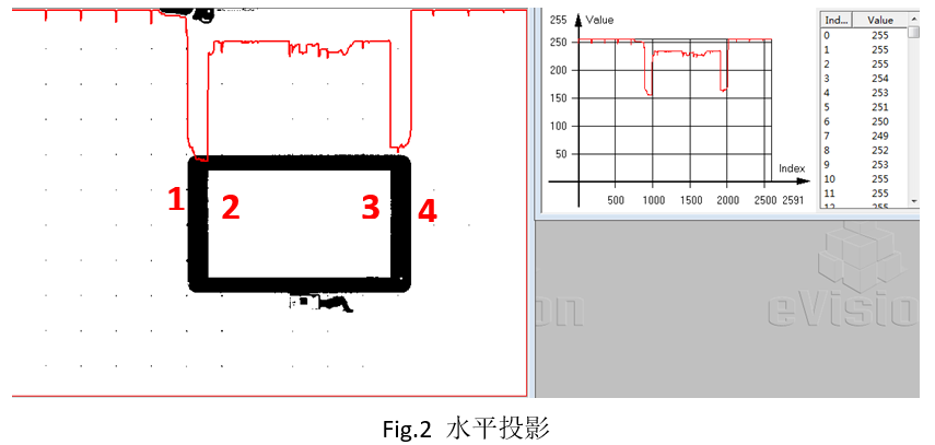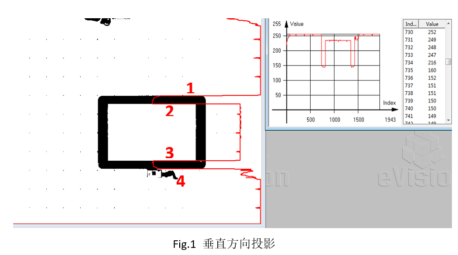 如圖1所示,通過垂直投影后,確認(rèn)了垂直方向上Y的突變點(diǎn),圖中通過垂直投影得到4個(gè)位置的突變點(diǎn),初步確認(rèn)Y方向的4個(gè)位置。