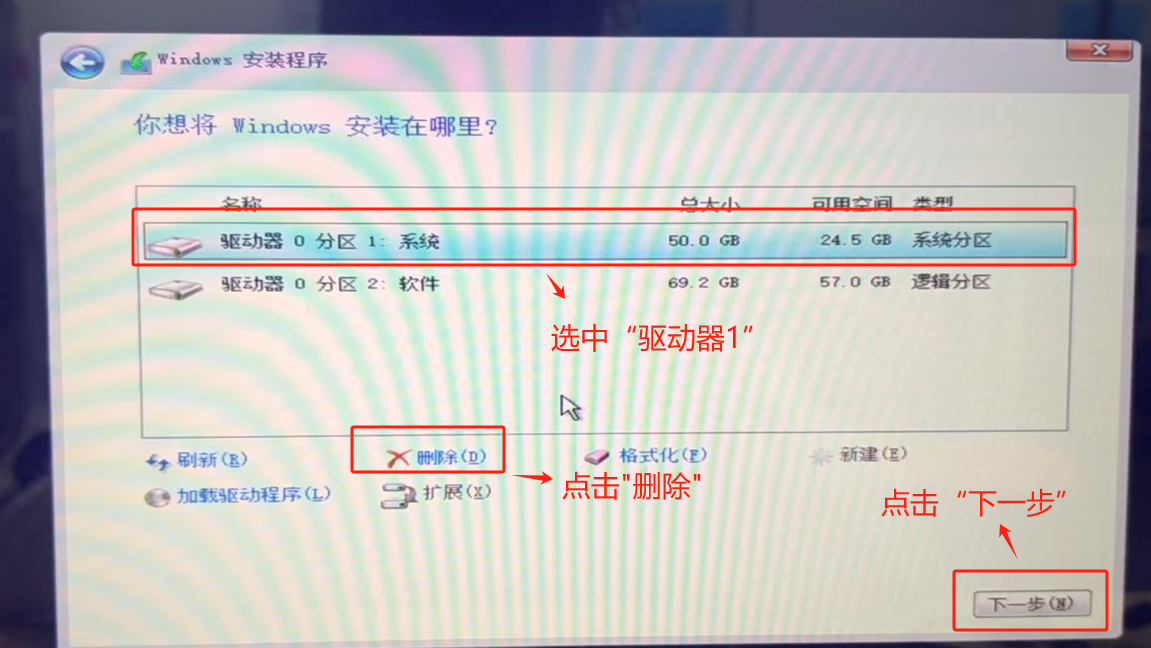 選中“驅(qū)動器0分區(qū)1:軟件”,點(diǎn)擊“刪除”,點(diǎn)擊“下一步”