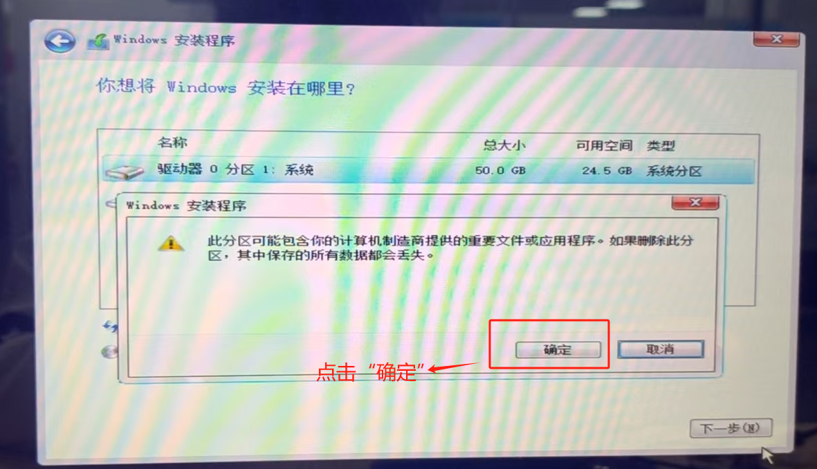 選中“驅(qū)動器0分區(qū)1:系統(tǒng)”,點(diǎn)擊“刪除”,點(diǎn)擊“下一步”