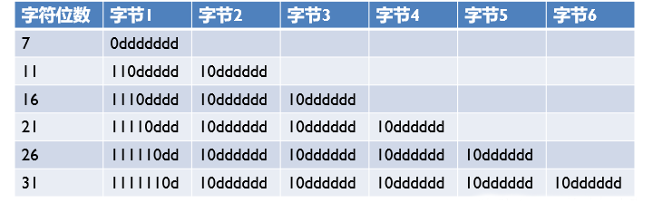 如圖所示,我們可以看到字節(jié)1中前面的數(shù)字本標(biāo)識(shí)字符的位數(shù),當(dāng)為0時(shí)表示7位,當(dāng)110時(shí)表示11位,然后字節(jié)1之后的所有字節(jié)均通過(guò)10開(kāi)頭,這就是它的格式。