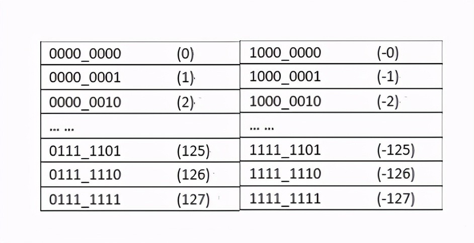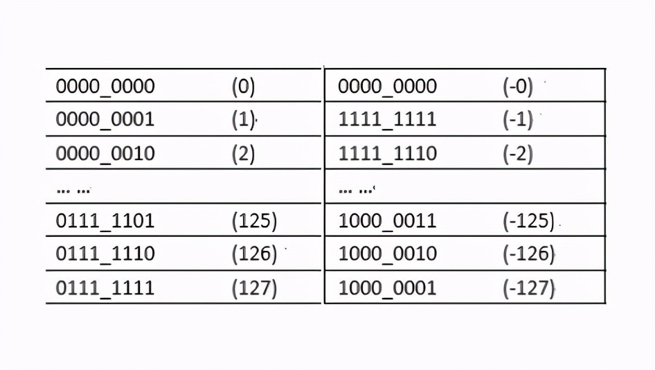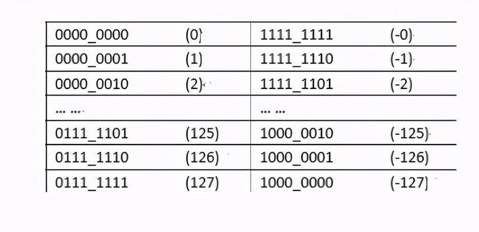 我們可以發(fā)現(xiàn)反碼滿足了負(fù)原碼中每增加一個(gè)二進(jìn)制單位對(duì)應(yīng)的是遞增的(1111_1110和1111_1111相比,1111_1111比1111_11110大),解決第一個(gè)問(wèn)題之后,還有第二個(gè)問(wèn)題,這個(gè)問(wèn)題就是0的問(wèn)題,因?yàn)闆](méi)有正0和負(fù)零的說(shuō)法,但是上面確有正零和負(fù)零區(qū)別,這就導(dǎo)致了重復(fù)的問(wèn)題,這個(gè)時(shí)候我們發(fā)現(xiàn)當(dāng)給負(fù)原碼加1,那么0就統(tǒng)一了,如下所示: