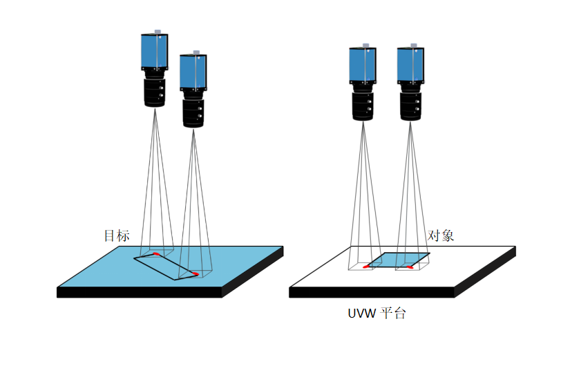 當(dāng)目標(biāo)端與對(duì)象端位置均不固定時(shí),需采用映射對(duì)位模型。該模型通過(guò)多相機(jī)建立空間映射關(guān)系,將目標(biāo)坐標(biāo)轉(zhuǎn)換至對(duì)象坐標(biāo)系: