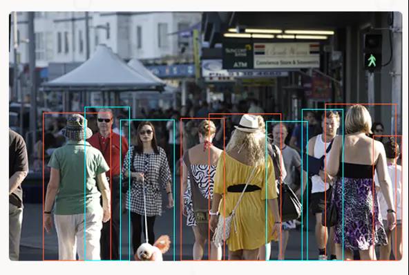 2.標(biāo)框標(biāo)注:機(jī)器視覺(jué)中的標(biāo)框標(biāo)注,很容易理解,就是框選要檢測(cè)的對(duì)象。如人臉識(shí)別,首先要先把人臉的位置確定下來(lái)。行人識(shí)別,如下圖。