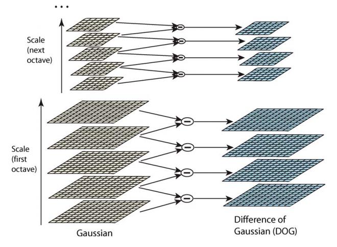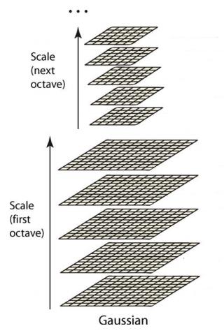 八度(octave) 簡單地說八度就是在特定尺寸(長寬)下,經(jīng)不同高斯核模糊的圖像的集合。八度的集合是高斯金字塔。