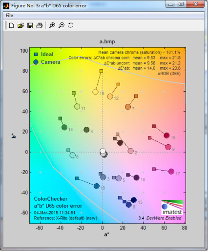 色彩還原指彩色CCD、CMOS經(jīng)過拍攝加工后,彩色攝影畫面的色彩大體上和原景物的色彩相一致。影響色彩還原的因素有CCD、CMOS的性能,攝影鏡頭的質(zhì)量,光線的色溫等。今天我們通過在D65光源下測試攝像頭對色彩的還原能力來聊聊如何使用Imatest進(jìn)行色彩還原測試。