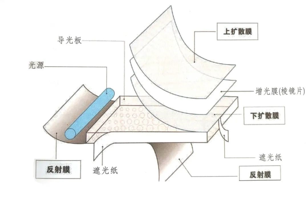 主要組成為發(fā)光源(Light source) 、導(dǎo)光板(light guide plate) 、膠框(housing) 、反射片(Reflector) 、擴(kuò)散片(Diffuser) 、增光片(BEF、棱鏡片)、黑白膠(Curtain Tape) 等。
