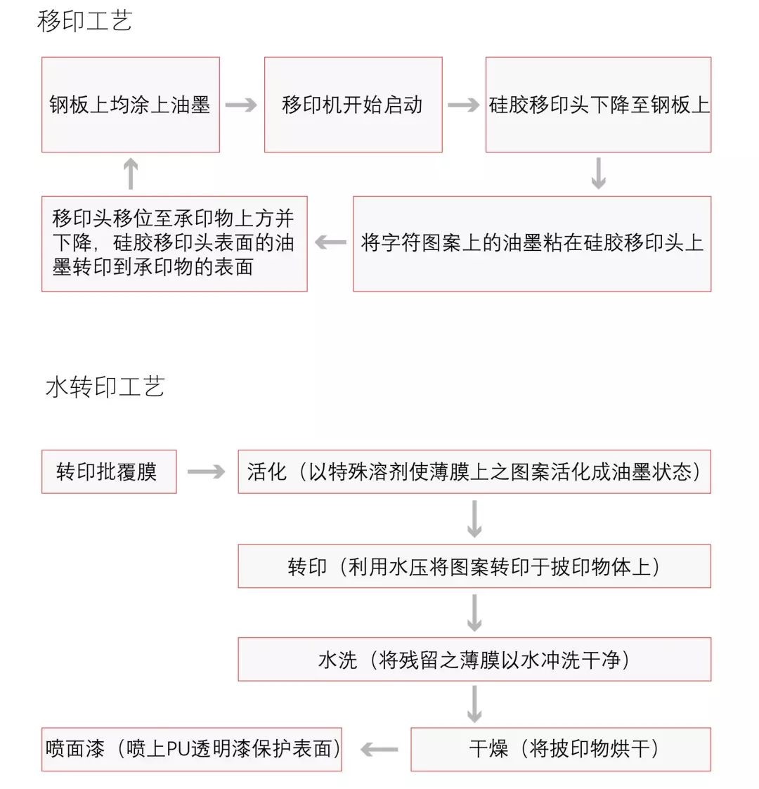 轉(zhuǎn)印批覆膜→活化(以特殊溶劑使薄膜上之圖案活化成油墨狀態(tài))→轉(zhuǎn)印(利用水壓將圖案轉(zhuǎn)印于披印物體上)→水洗(將殘留之薄膜以水沖洗干凈)→干燥(將披印物烘干)→噴面漆(噴上PU透明漆保護(hù)表面)