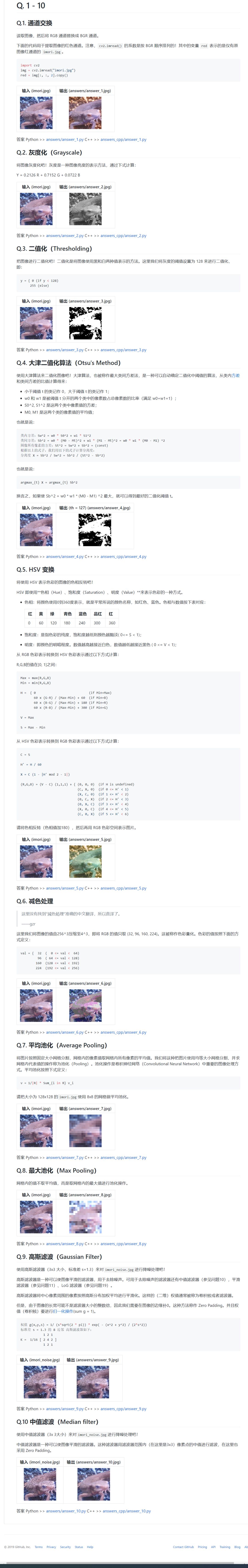 本文整理了圖像處理初學者應(yīng)該需要了解的100個基礎(chǔ)問題,涉及讀取、顯示圖像、操作像素、拷貝圖像、保存圖像、灰度化(Grayscale)、二值化(Thresholding)、大津算法、HSV 變換、減色處理、平均池化(Average Pooling)、最大池化(Max Pooling)、高斯濾波(Gaussian Filter)、中值濾波(Median filter)、仿射變換(Afine Transformations)等100多個知識點。