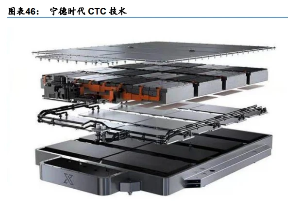 傳統(tǒng)模組改進方向為 CTP、CTC 技術,達到空間利用率的提升。CTP 指電芯直接集成到電 池包內(nèi),省去電池模組;CTC 為 CTP 的延伸,在省去模組的基礎上進一步省去打包過程, 將電芯直接集成到汽車底盤上,實現(xiàn)更高程度集成化。根據(jù)寧德時代的數(shù)據(jù),CTP 相比于 傳統(tǒng)電池包,可以使體積利用率提升 15%-20%,零件數(shù)量減少 40%,生產(chǎn)效率提升 50% 并降低動力電池的制造成本。CTC 電池技術的空間利用率最高,對于電池電量的提升有顯 著的效果。